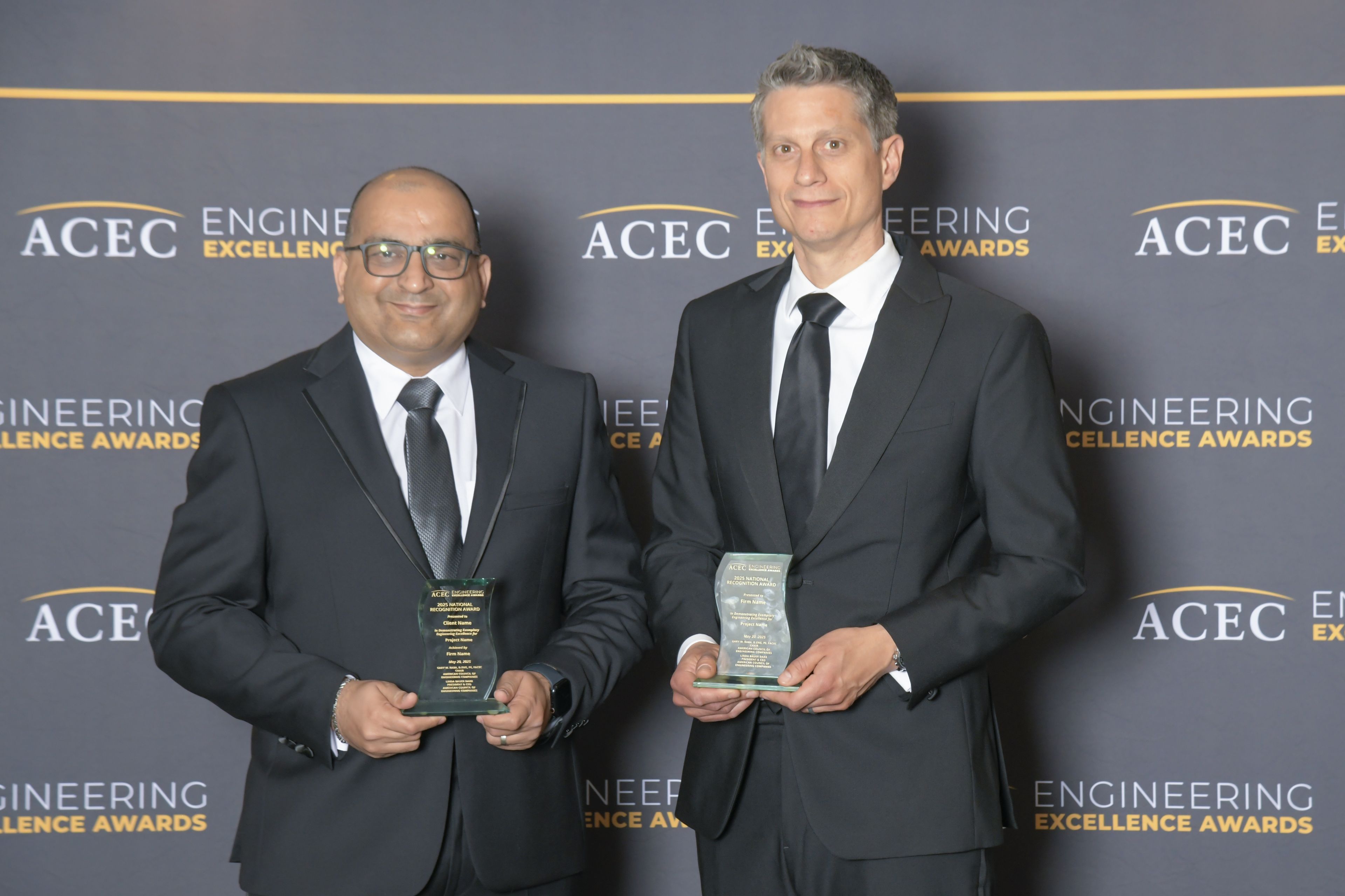 DeSimone was honored with two awards at the 2025 ACEC New York Engineering Excellence Awards Gala, celebrating the firm’s continued commitment to innovative, sustainable, and resilient design. Managing Principal Mukesh Parikh and Principal Jarret Johnson accepted the Diamond Award for Millennium Partners’ Winthrop Center in Boston, a 691-foot-tall tower now recognized as the tallest building in the city’s Financial District. The Handel-designed project also includes the largest Passive House office space in the world. To achieve its striking design, DeSimone engineered a structural solution for “The Connector,” a dramatic civic space that spans three stories and cuts through the block. A steel-framed deck supported by concrete mega-columns was designed to support the full weight of the tower above the open area.