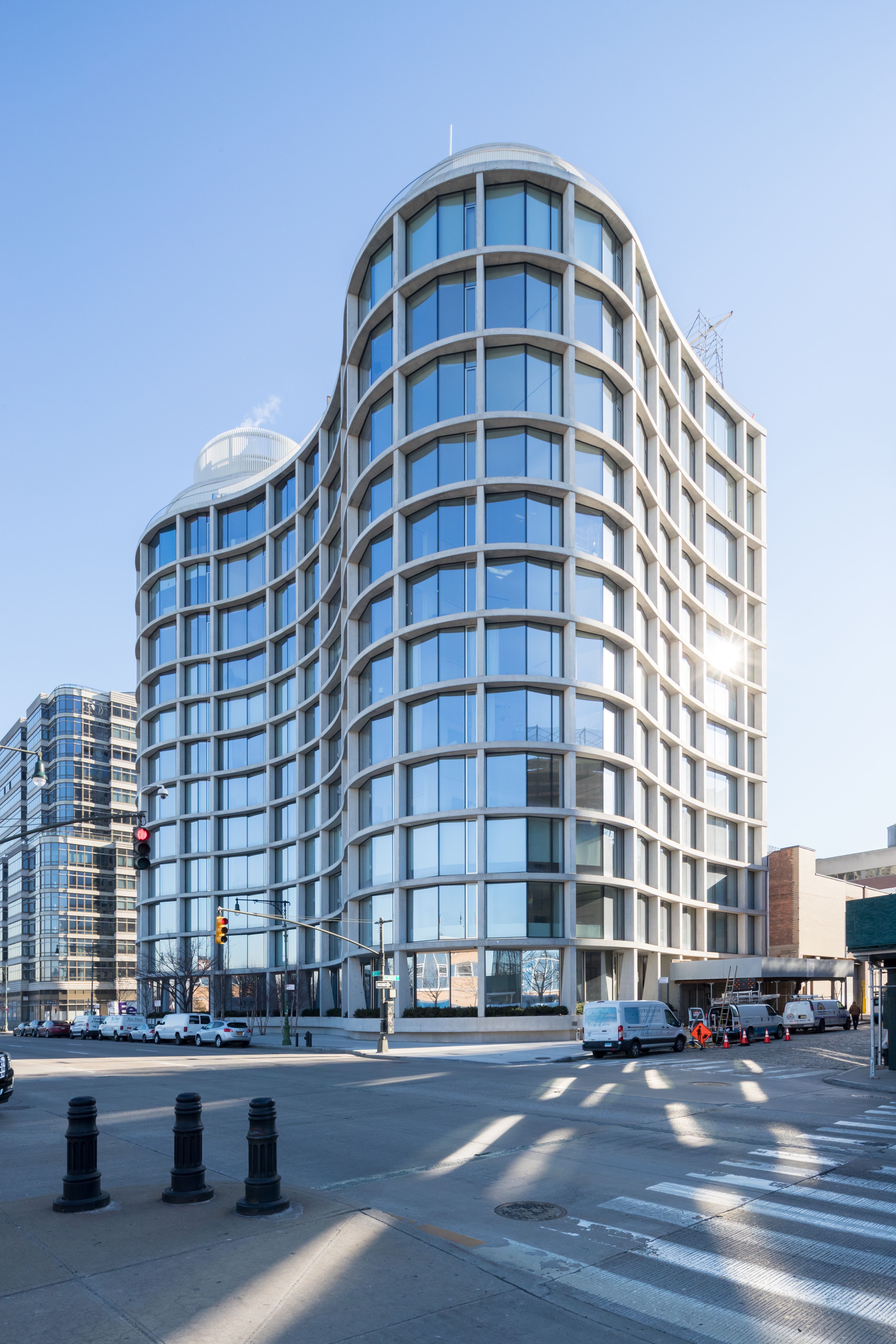 Set along the Hudson River waterfront, 160 Leroy Street is a 12-story residential building defined by a curved white concrete façade and diamond-faceted glazing.