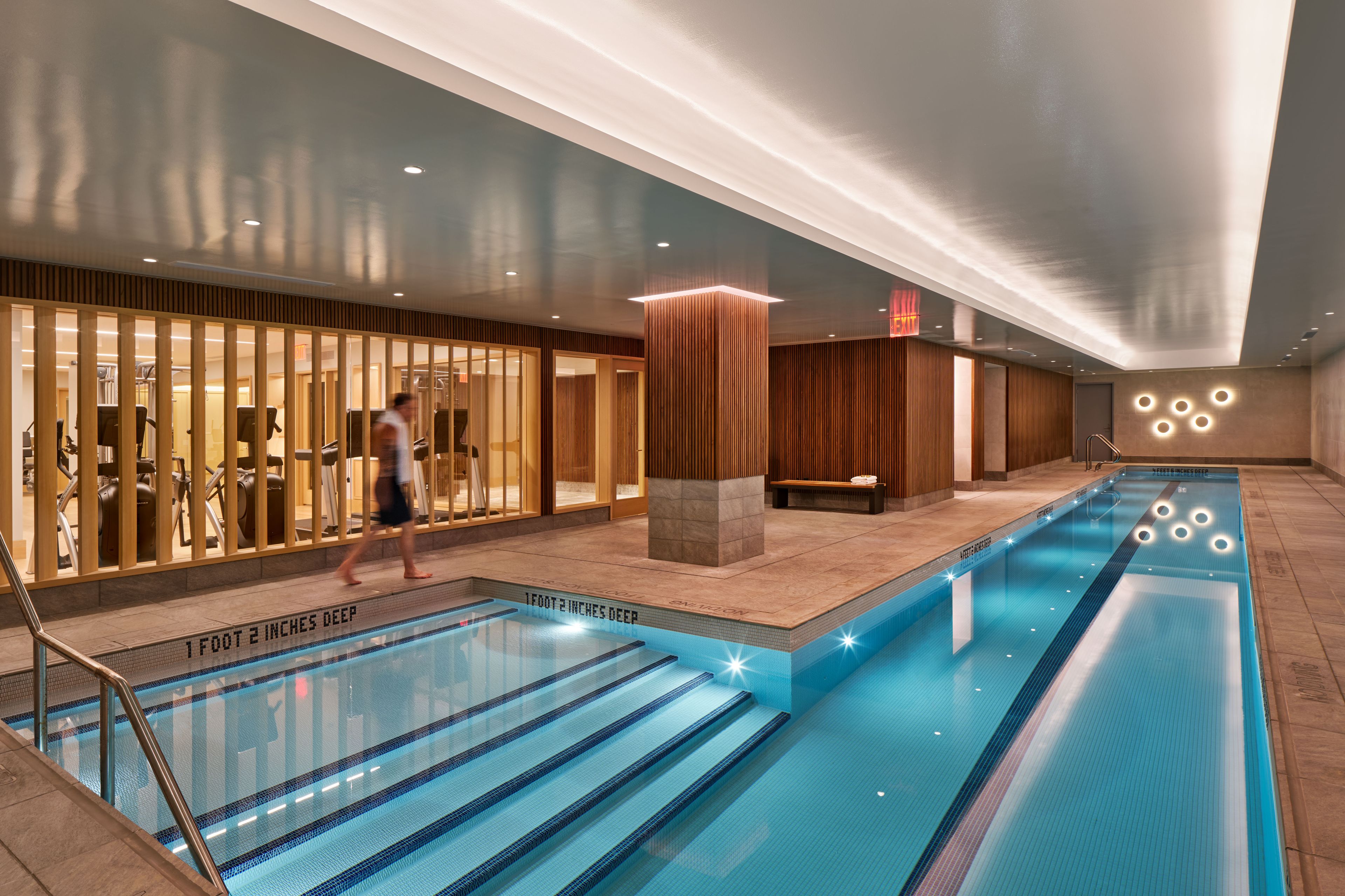 The structural design connects a new cast-in-place concrete building to an existing steel and cinder-slab structure. The 13th-floor roof of the original building was removed and reconstructed at a lower elevation. A new, full-lot concrete slab at the 14th floor was added above the existing building, along with partial 15th and 16th floors. Below grade, two basement levels accommodate mechanical spaces, parking, and amenities including a squash court and lap pool.