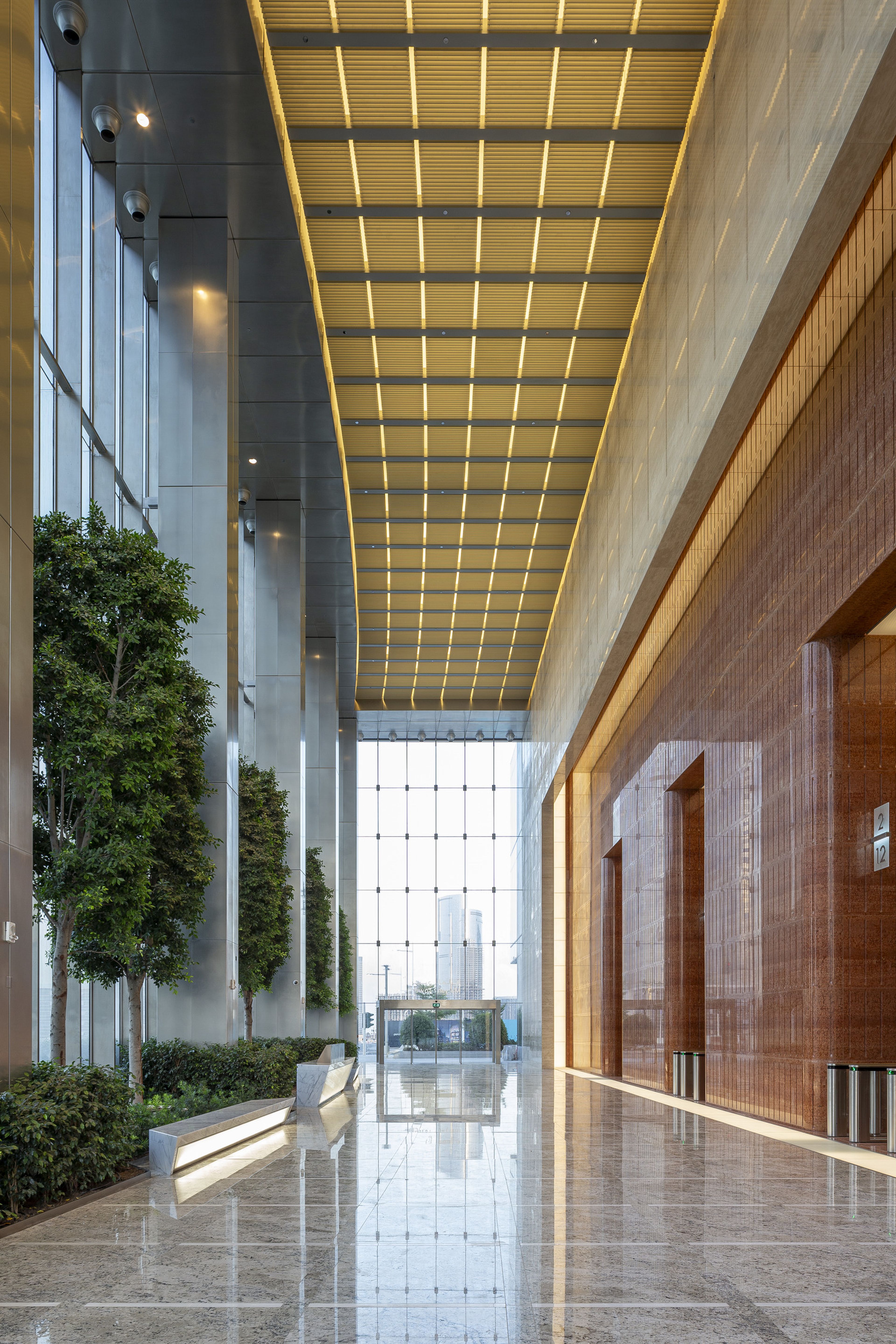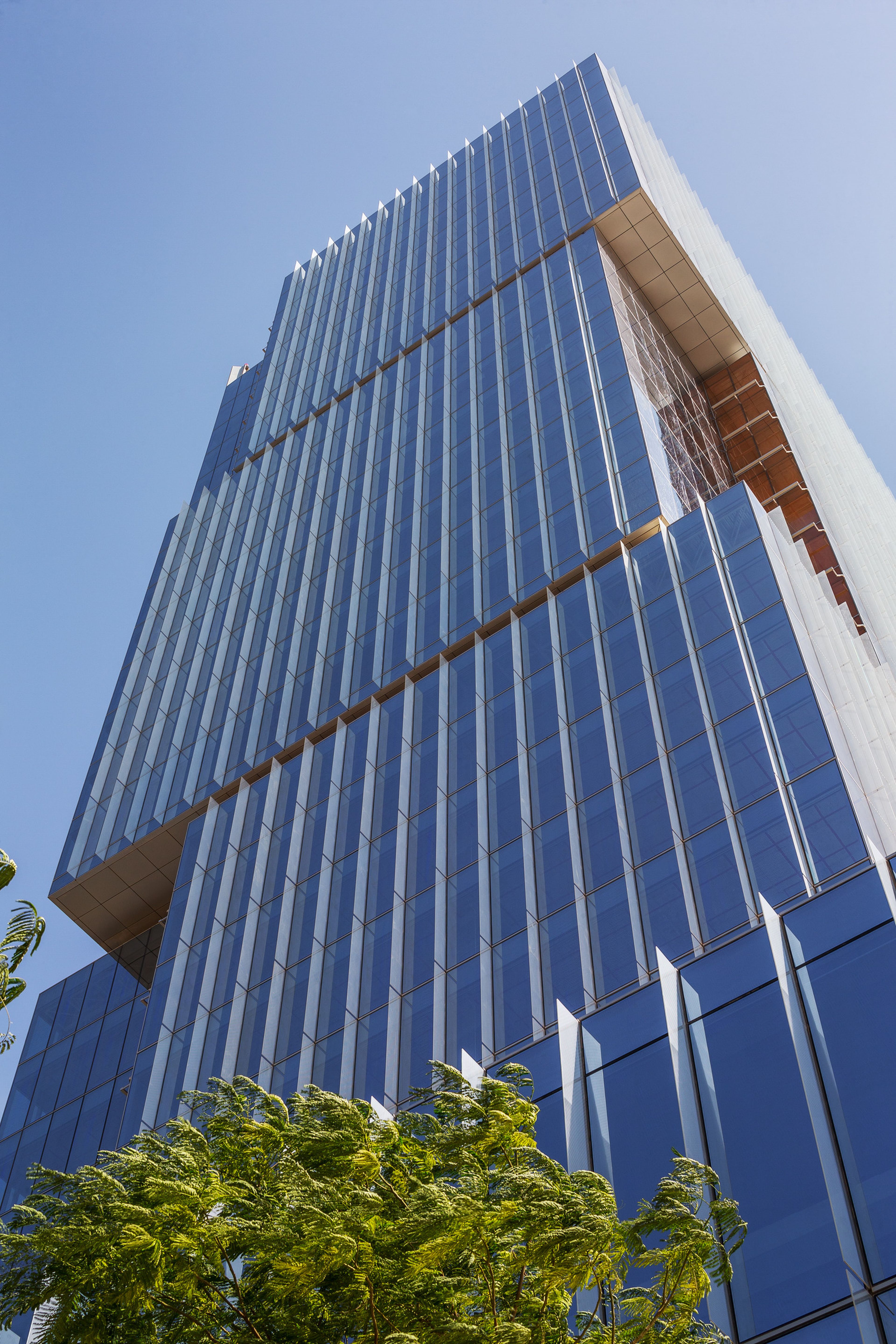 The façade is an aluminum-and-glass curtain wall with vertical fins and sun control elements anchored into slab edges using embedded hardware designed for wind loads and thermal movement. Floor-to-ceiling glazing floods interiors with daylight while maintaining energy performance.