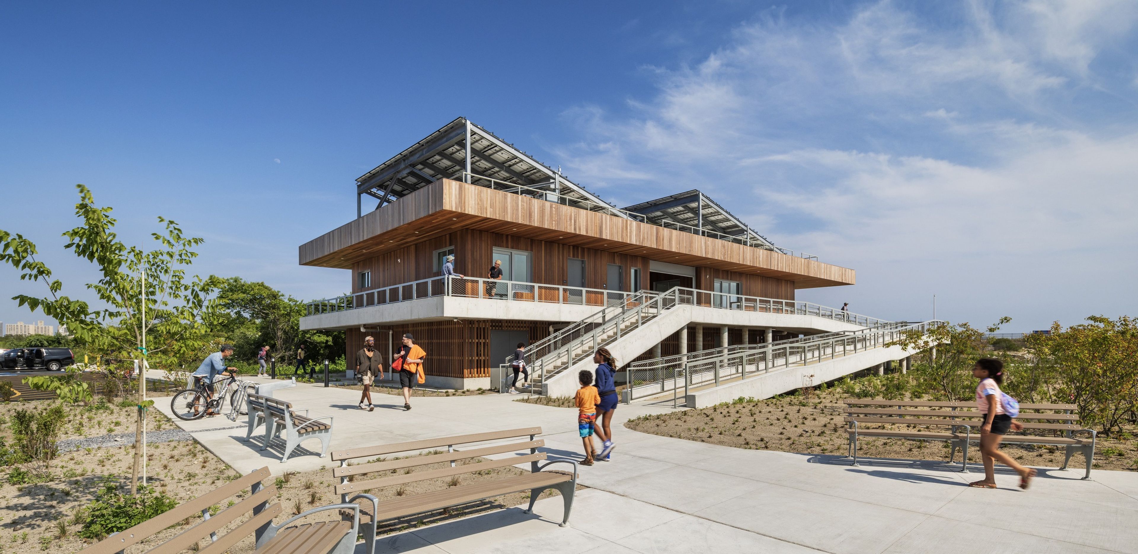 Designed by WXY with structural engineering by DeSimone, the facility is part of the broader Arverne East development and supports NYC Parks operations, local nonprofits, and public education initiatives.