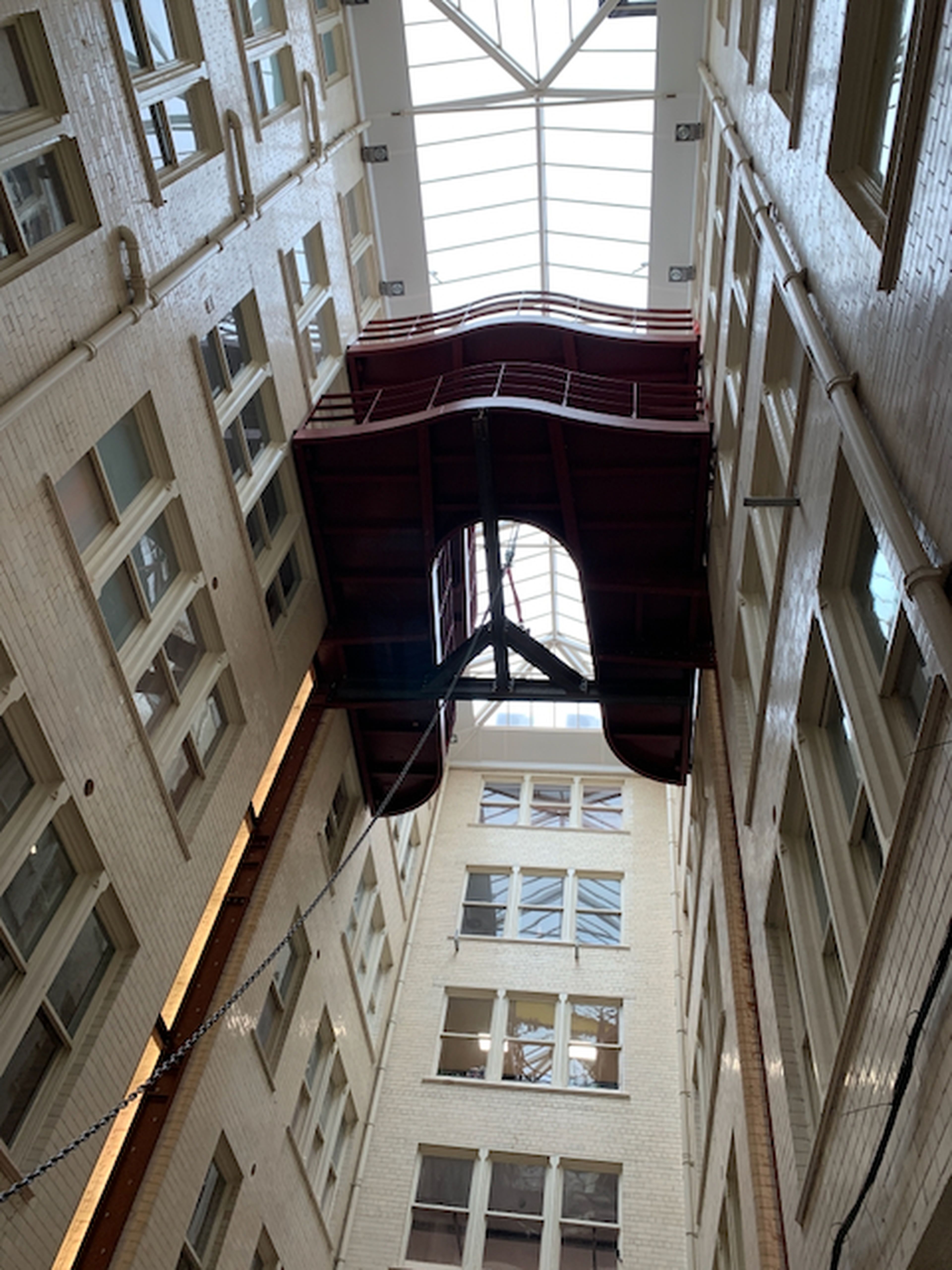 The new steel structure offers cantilevered support for these walkways, each built at ground level and lifted it into place individually on a phased, weekend timeline so that the building could remain open and operational for existing commercial tenants.