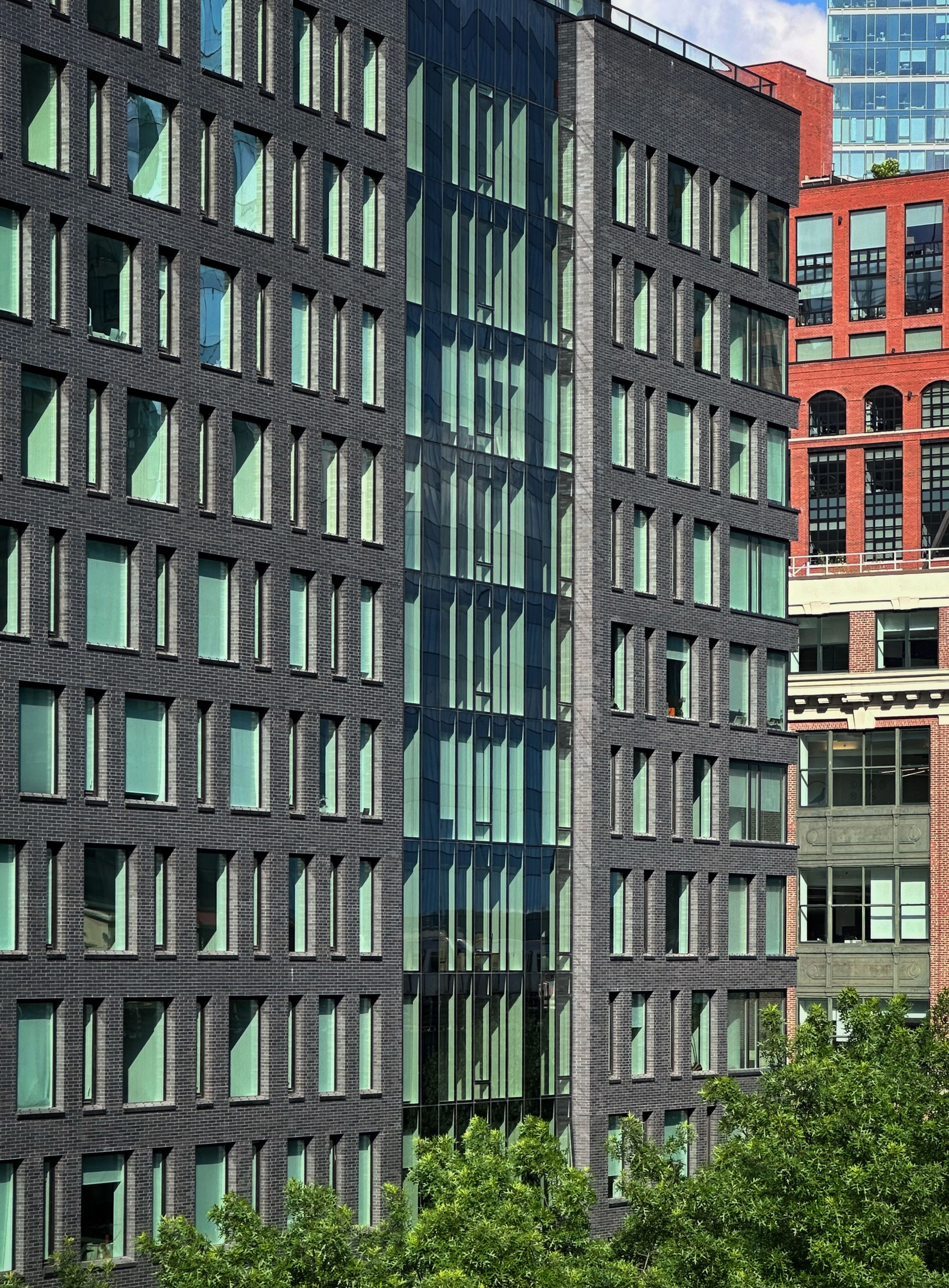 On the building exterior, our façade and building envelope team collaborated with the architect in the design of a dark brick facade inspired by the area's industrial past and punctuated by an irregular grid of punched windows. The façade includes three types of glazing, including bird-friendly glazing, a glass curtain wall, and storefront windows for the 7,000 SF of retail at ground level. At the tower top, the window pattern extends the facade past the top floor and encloses the rooftop amenities.