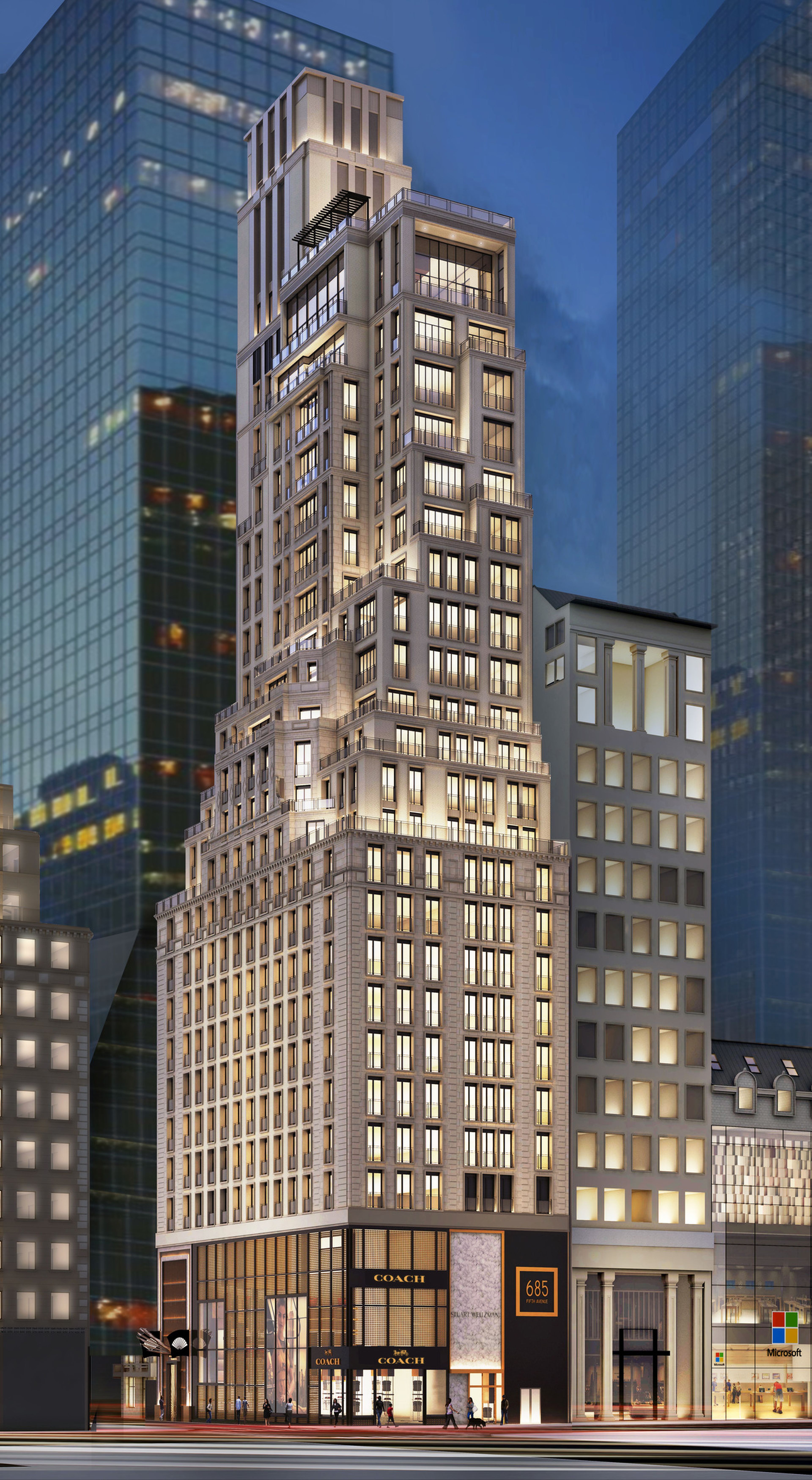 Once the site of Gucci’s New York City headquarters, the mixed-use 685 Fifth Avenue was completely converted into Mandarin Oriental’s first exclusively residential property on the East Coast. The building was originally constructed in two stages – with the northern steel structure built in 1926 and the southern concrete expansion completed in 1999.