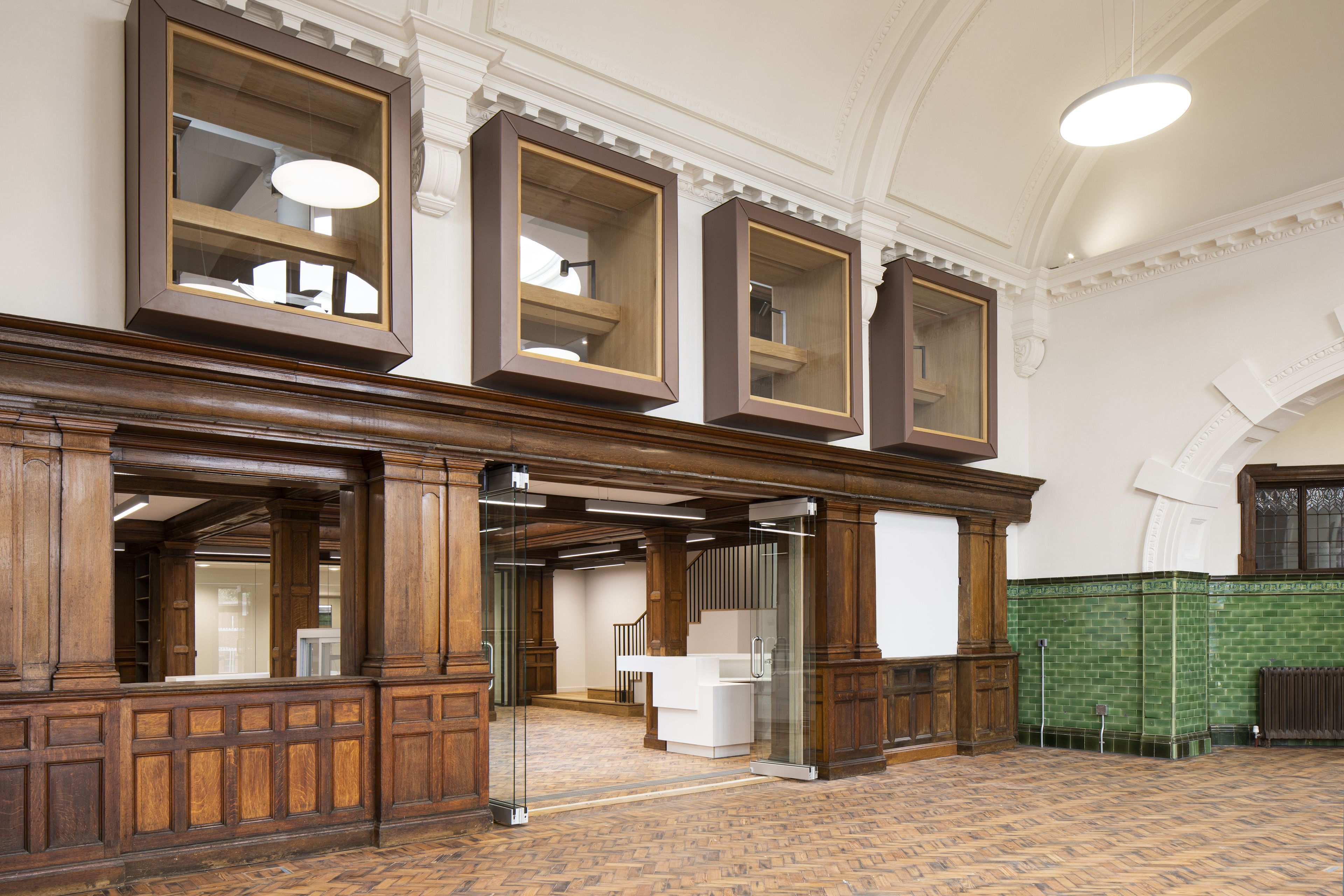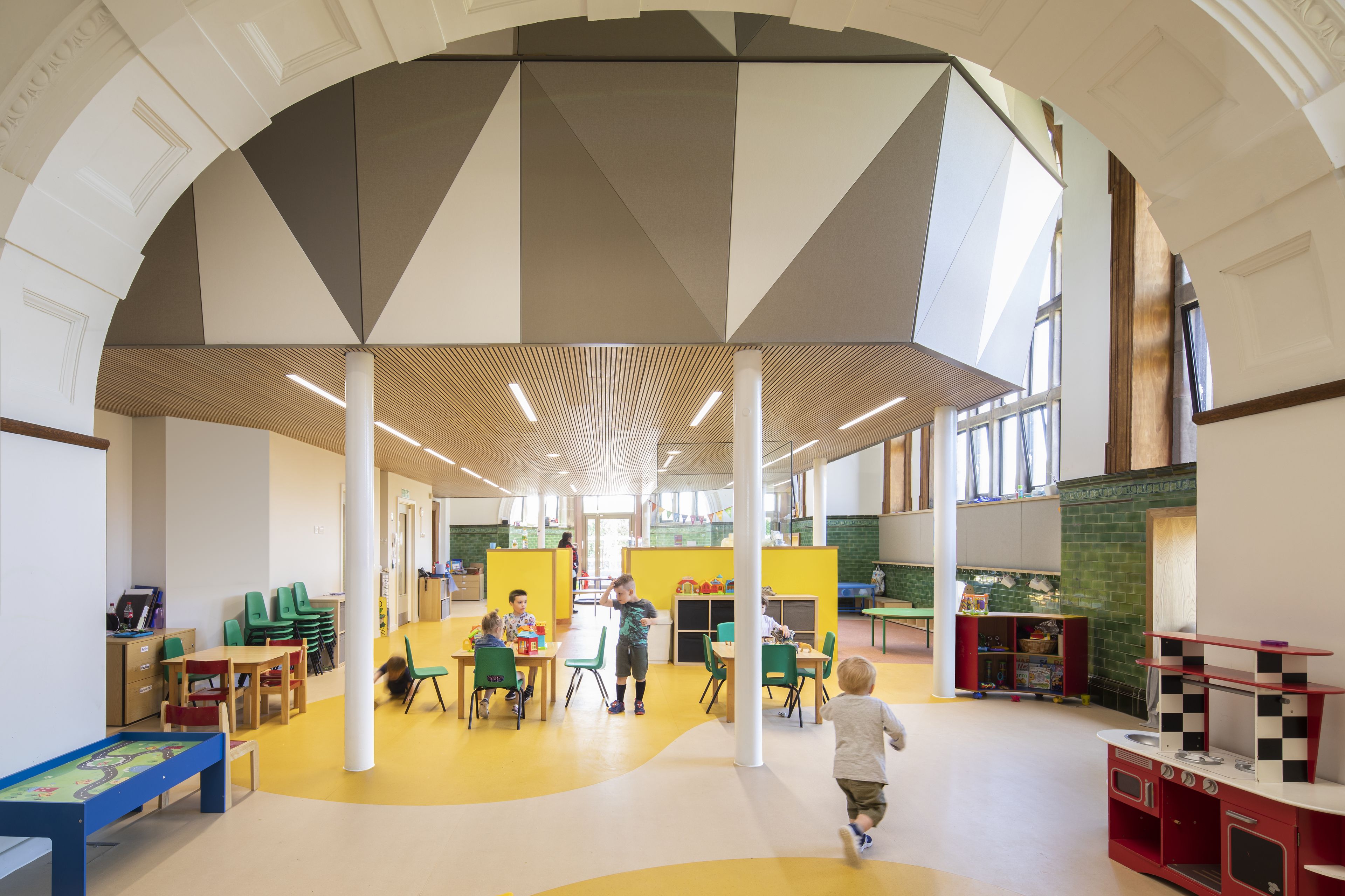 One reading room has been entirely preserved and refurbished as the main multi-use space, while significant interventions made to the second reading room created a contemporary nursery space.