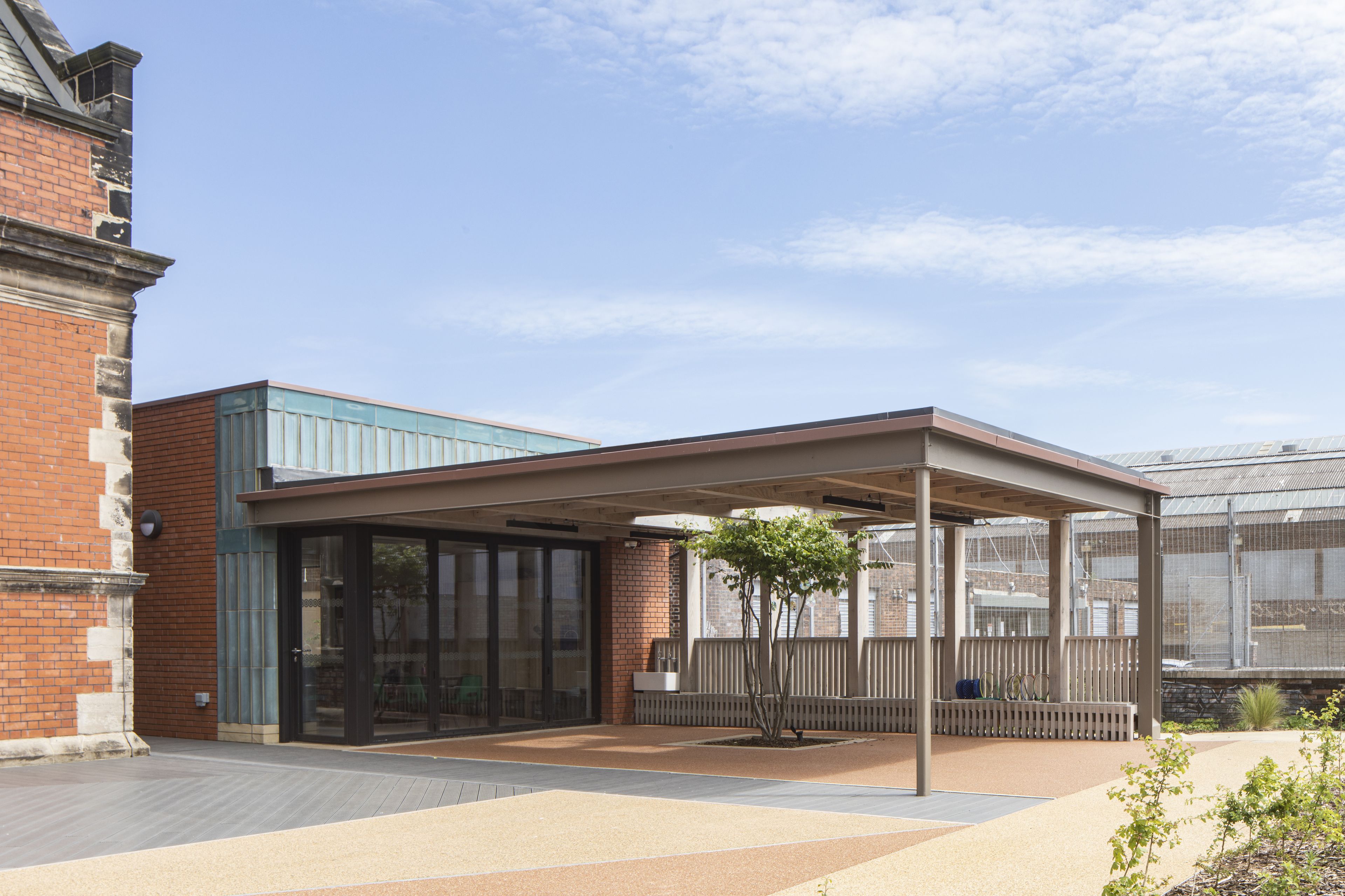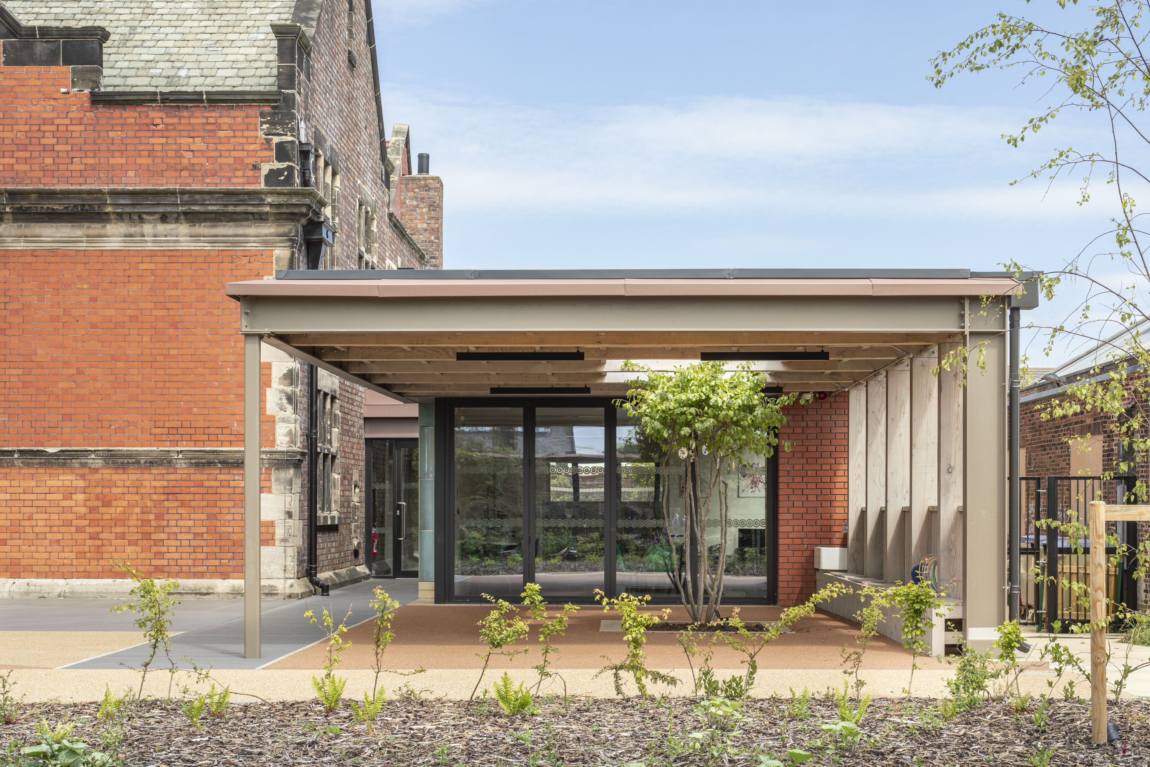 A single-story extension provides a café and social space clad in ceramic tiles to complement the original internal detailing.