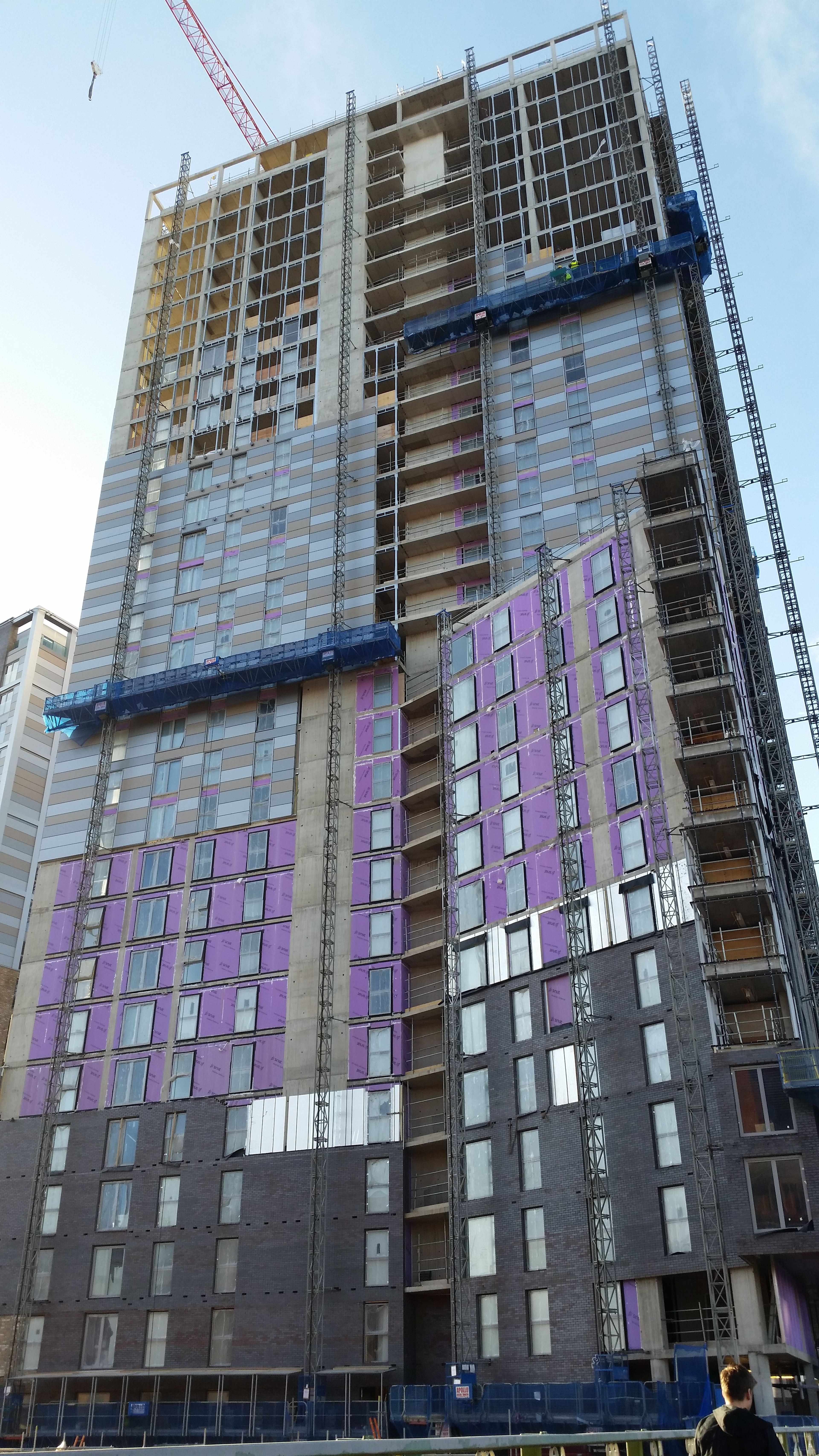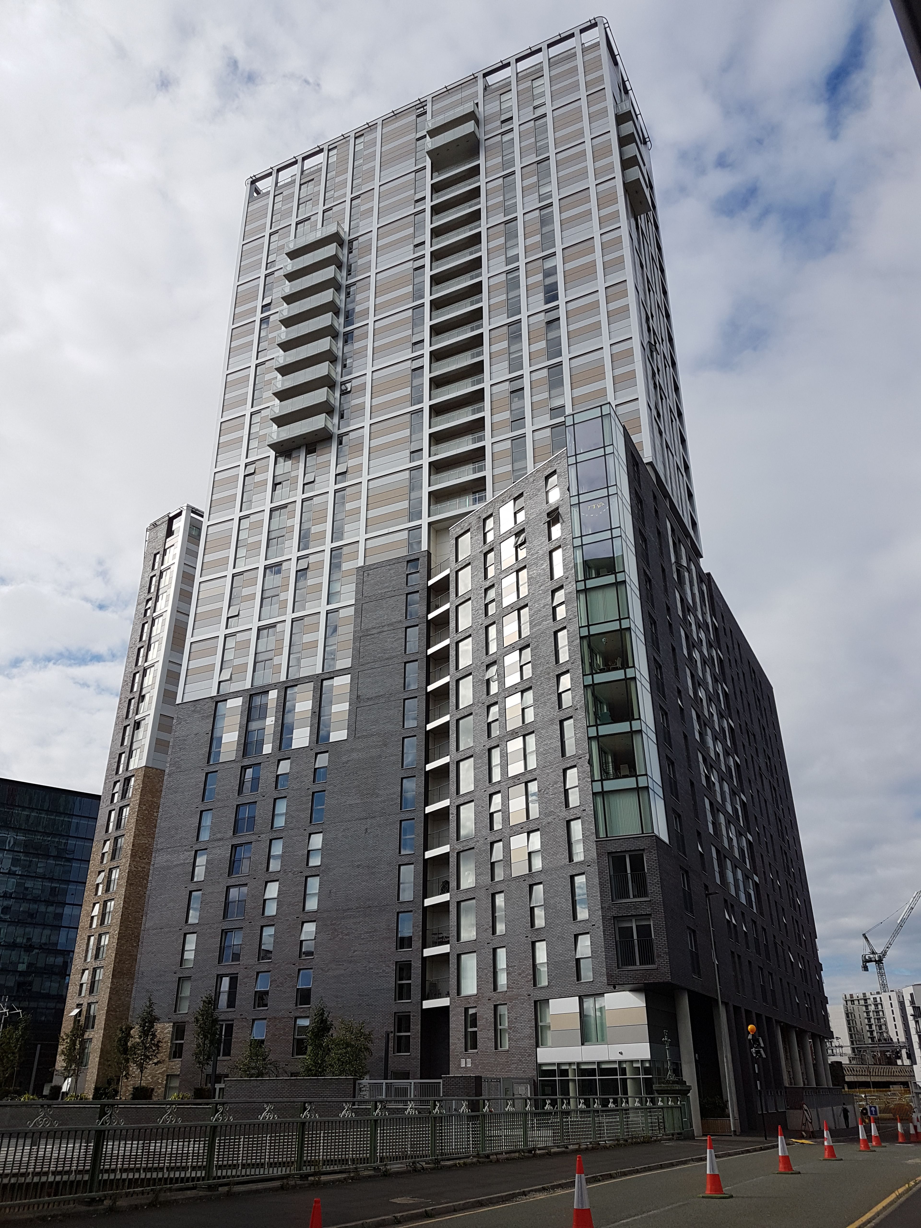 A collection of four buildings—ranging in height from 10 to 31 stories—arranged around a courtyard along the River Irwell, One Greengate consists of 500 apartments and three levels of basement parking for 220 vehicles.