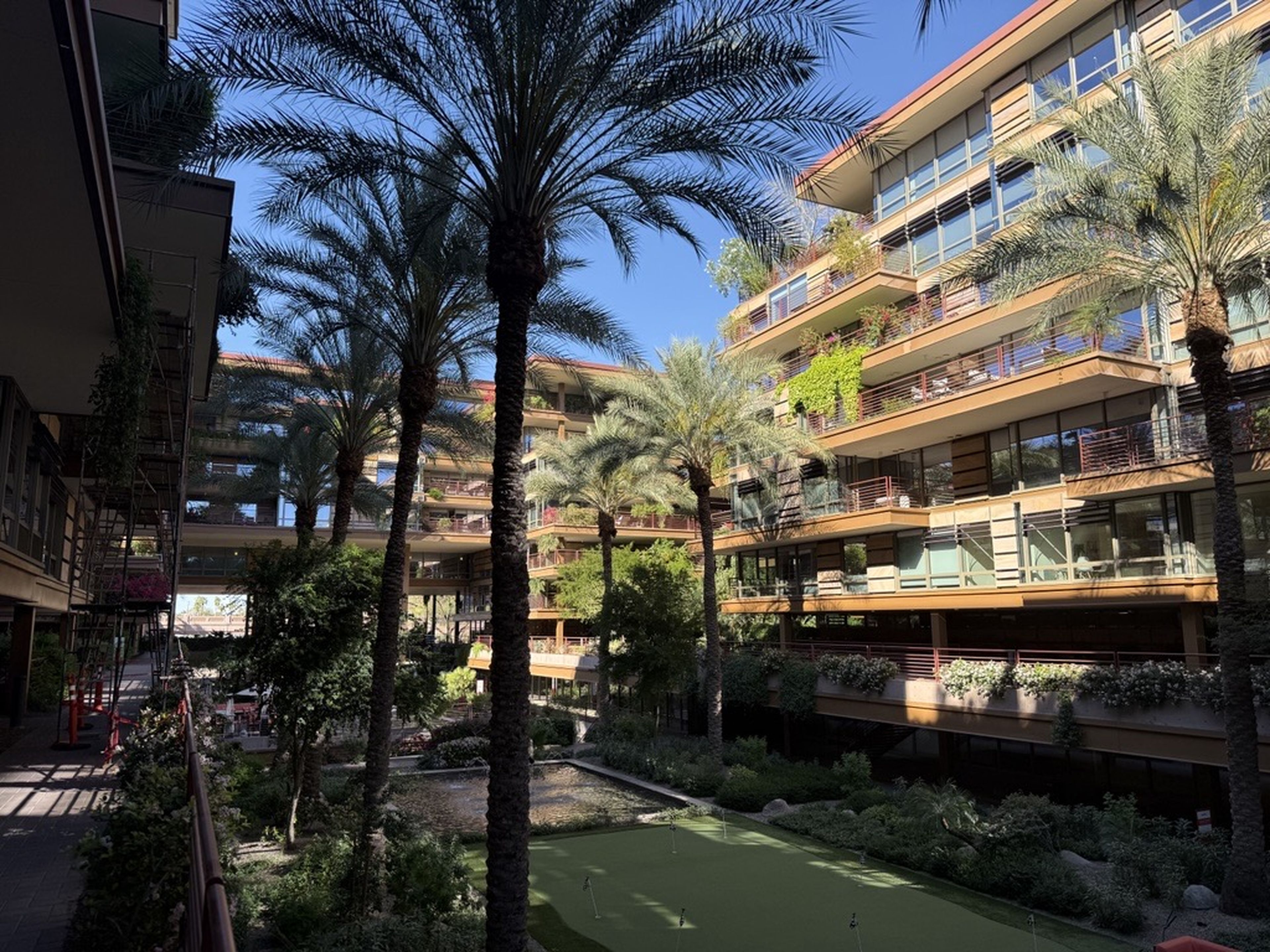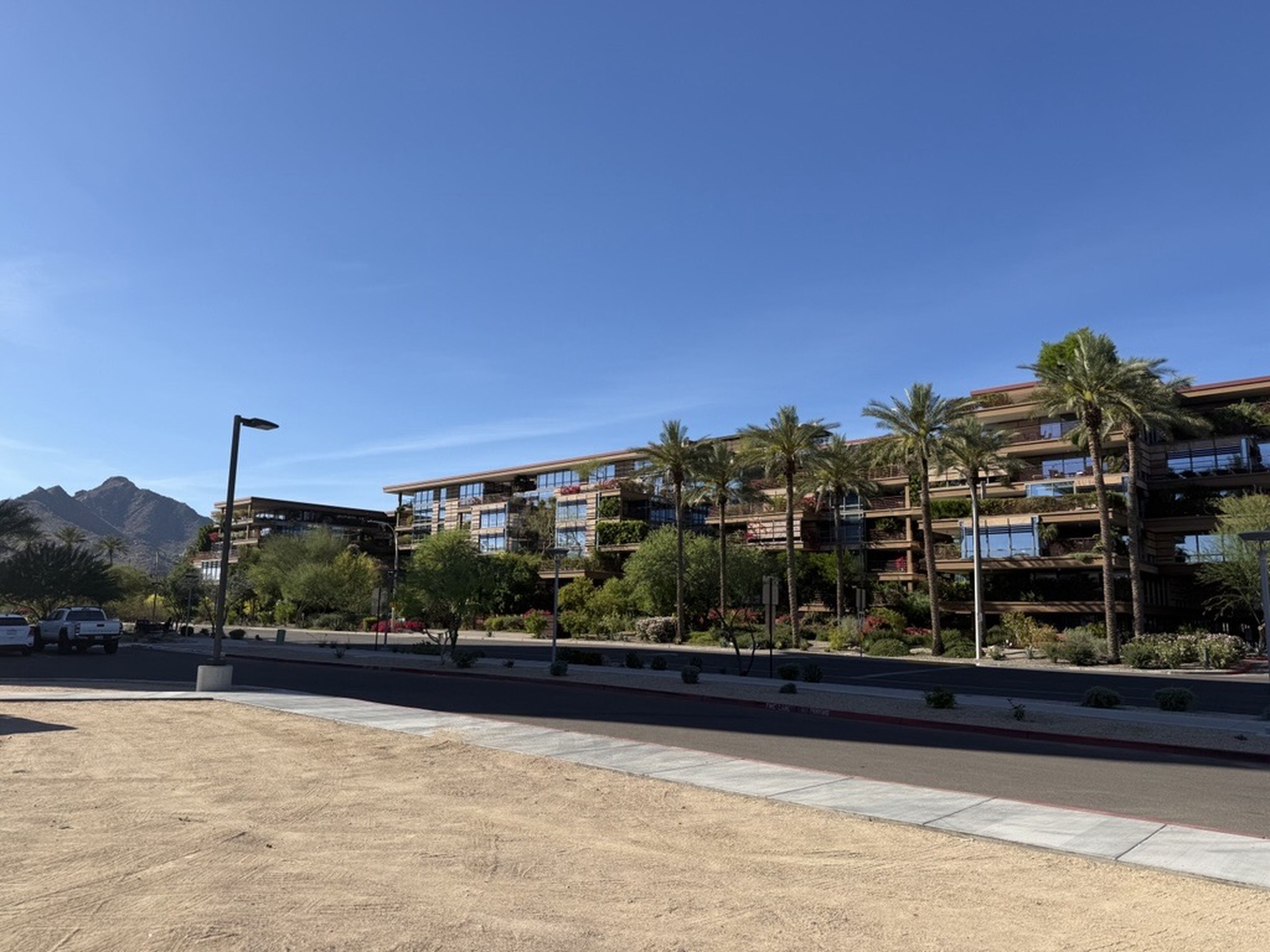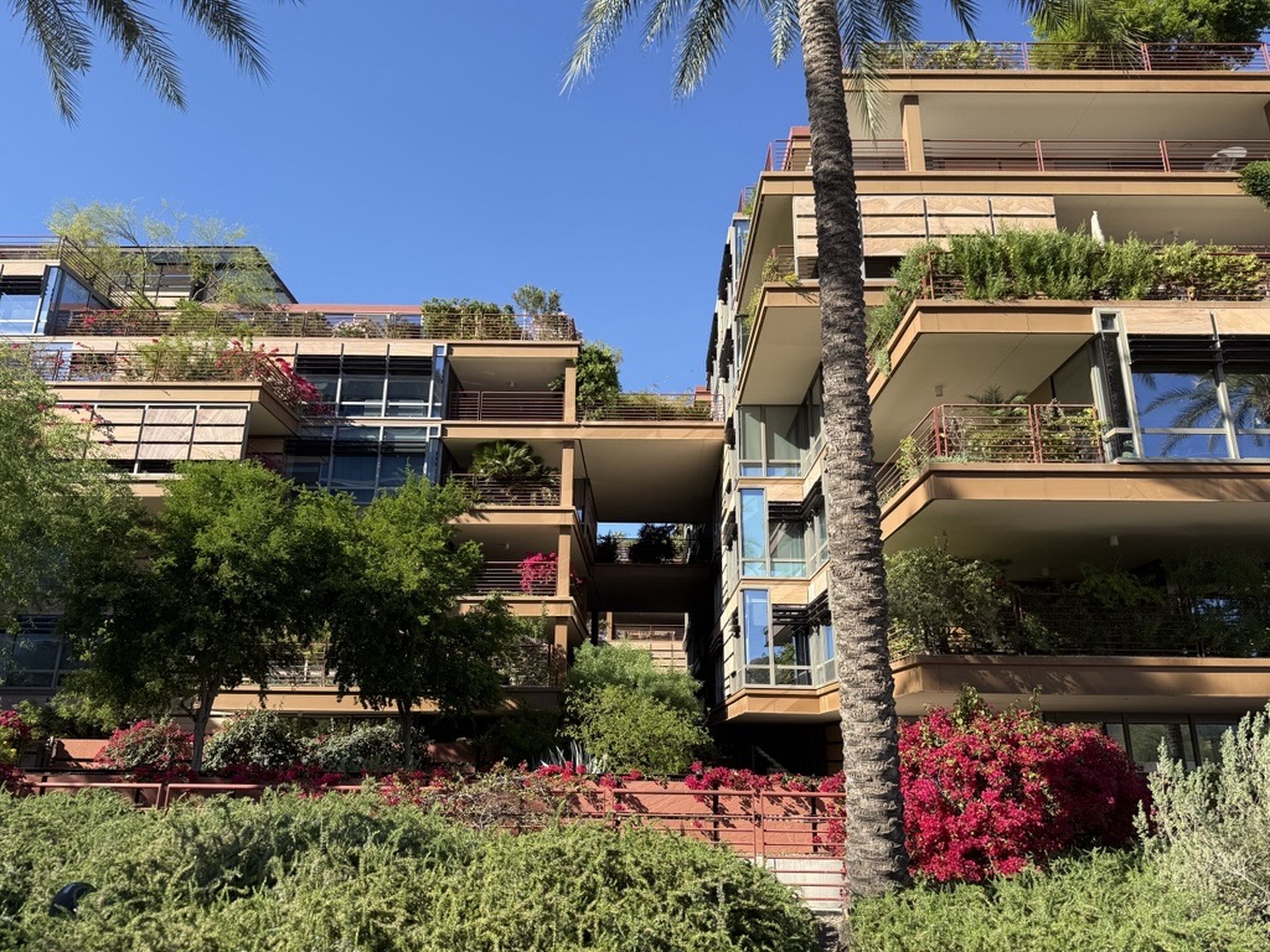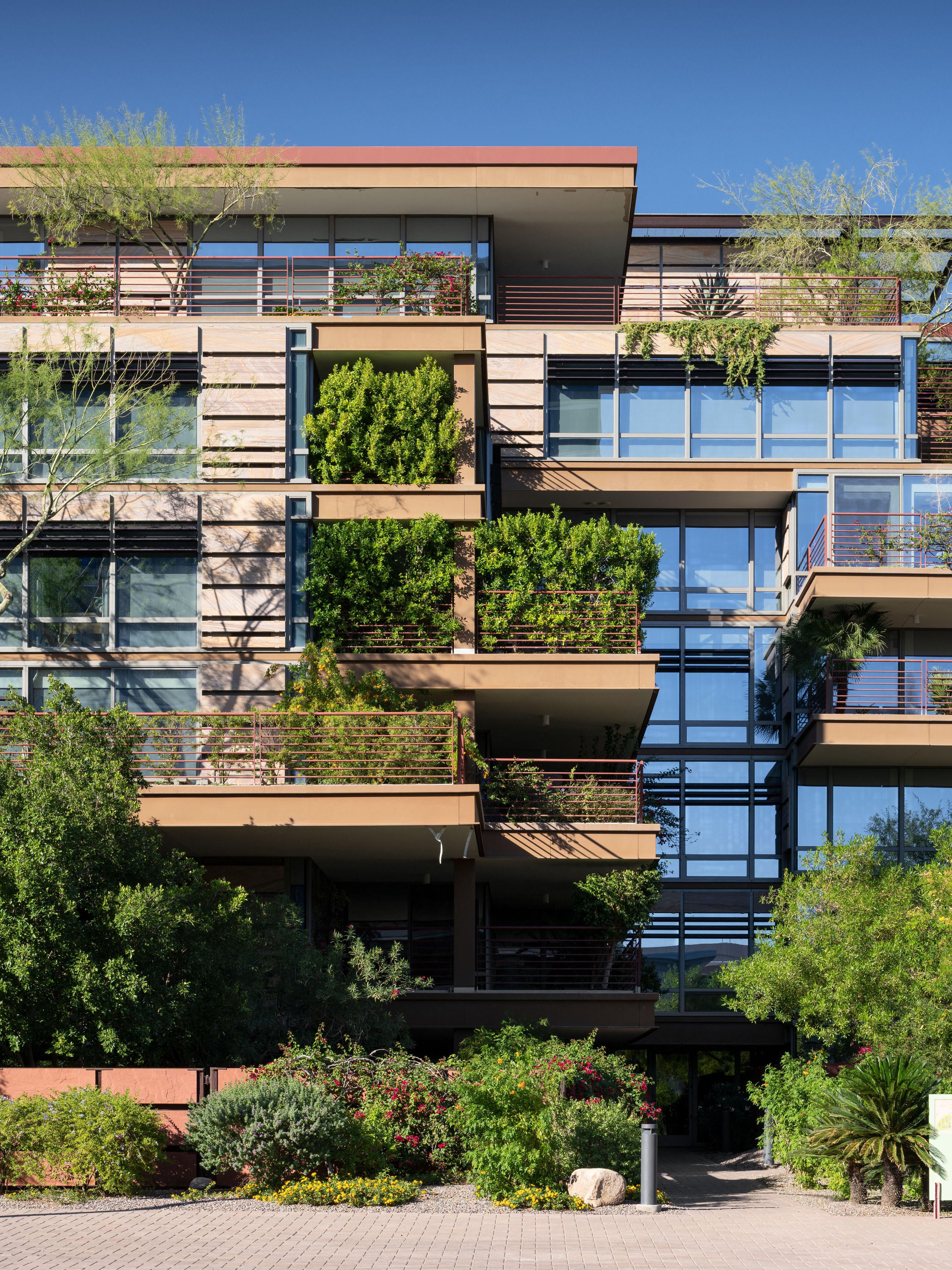 A unique terrace planting system, developed in collaboration with Arizona State University, helps with thermal insulation, improves stormwater retention, and provides passive shading for the glass facades. The complex adapts more standard sustainable elements for Arizona’s desert climate.