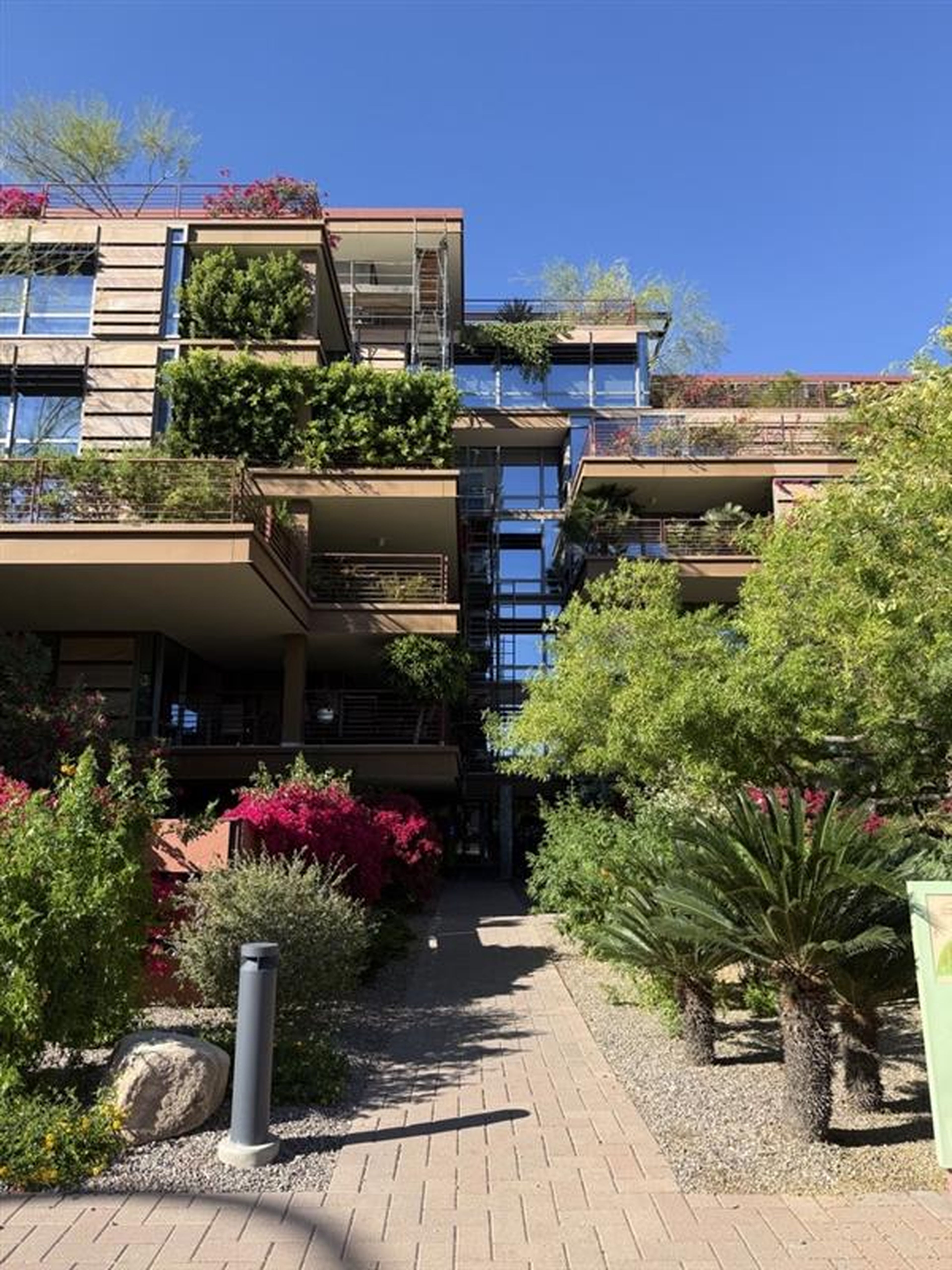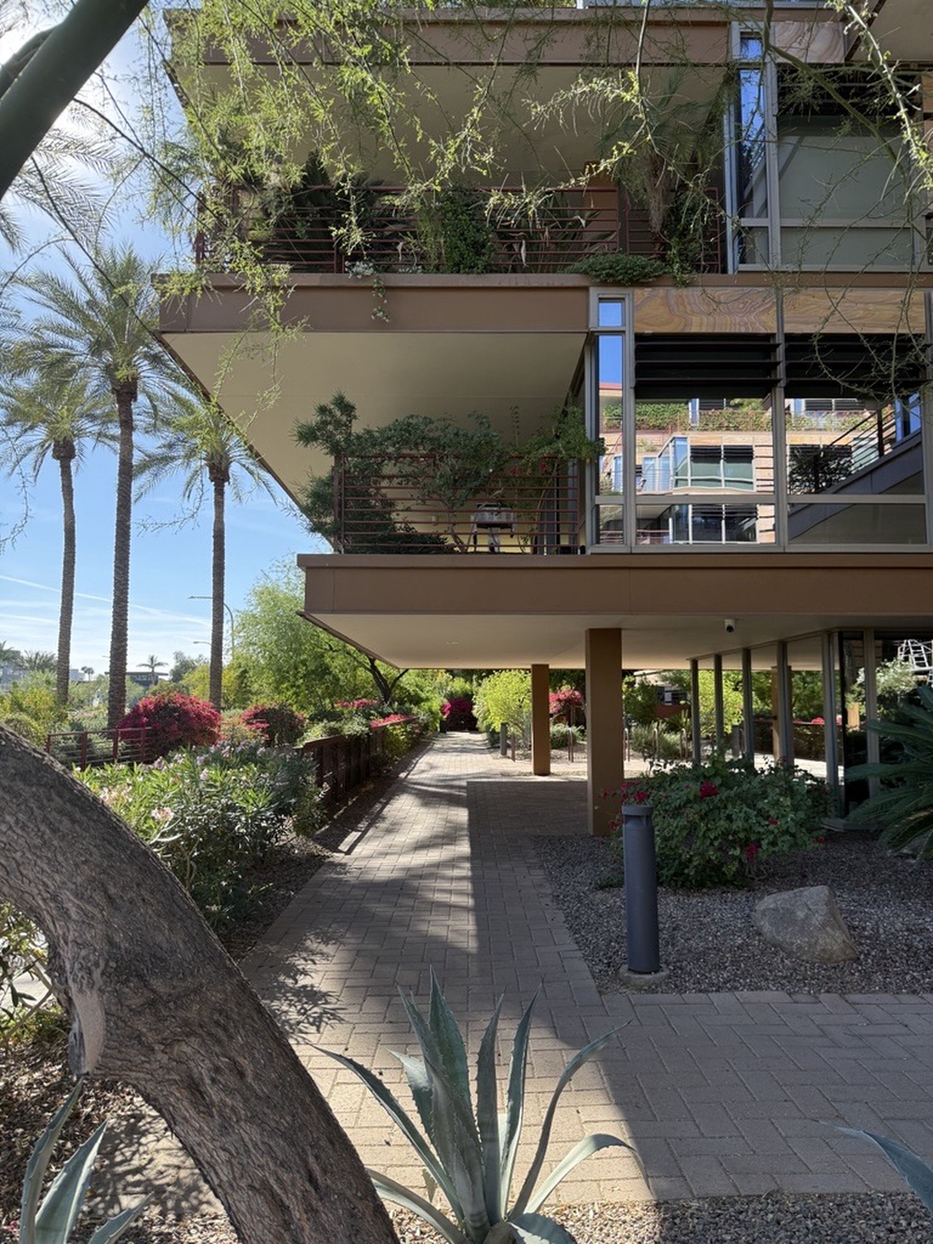 Designed with a strong focus on sustainability and environmental elements, no two buildings on the 12-acre Optima Camelview Village are exactly alike. The steel framing in each of the complex’s 11 buildings features large cantilevers—up to 20 feet—that support planted, stepped terraces and 23-acres of rooftop gardens. Linked by a series of walkways and pedestrian bridges, the community has an inherent, interconnected feel.