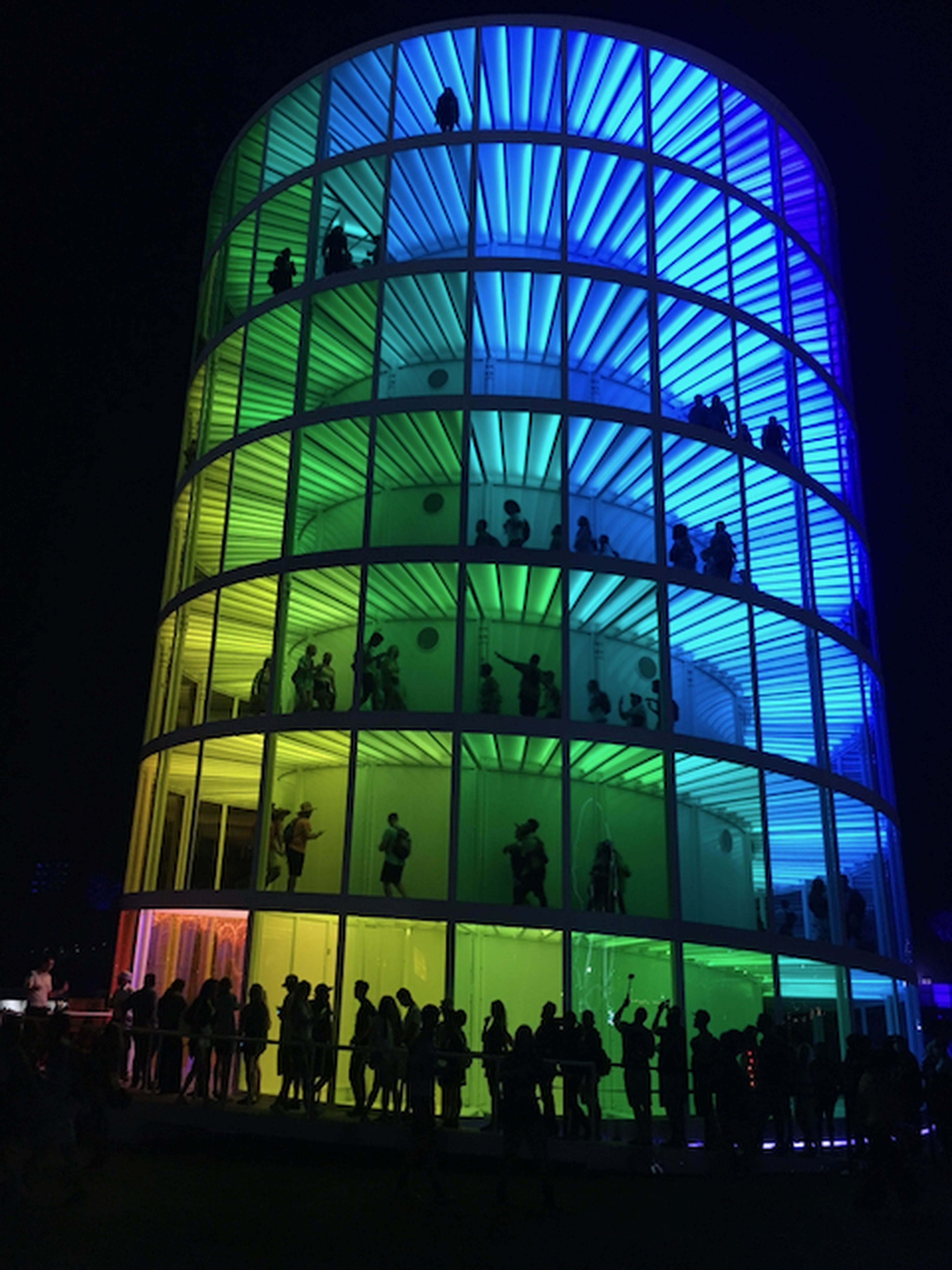 Bringing color and height to Coachella, one of the world's most iconic music and arts festivals, Spectra is a cylindrical tower and architecturally informed creative installation featuring a spiral design, an observation deck, and a dazzling color light scheme that reflects Coachella’s energy and breathtaking setting.