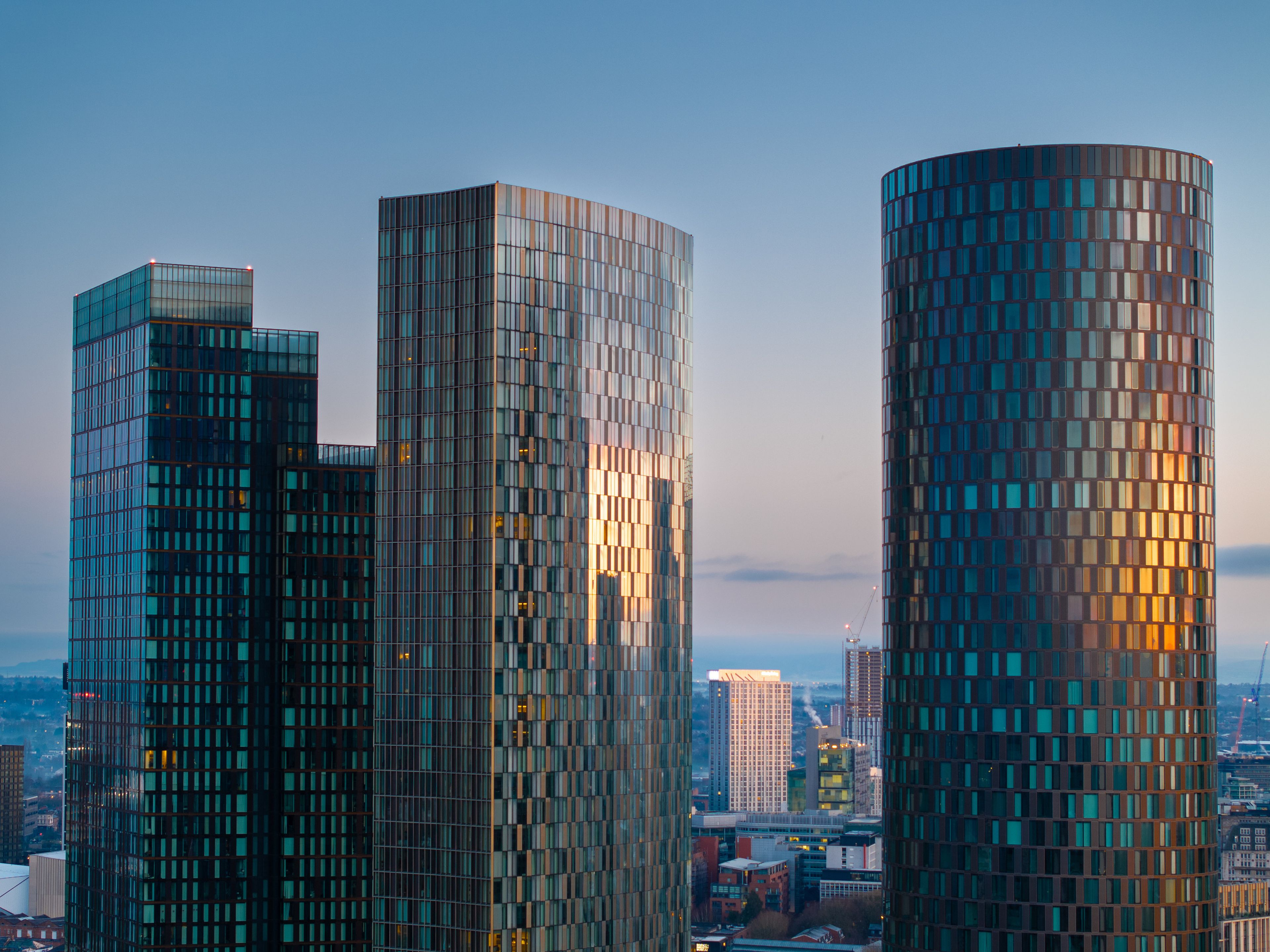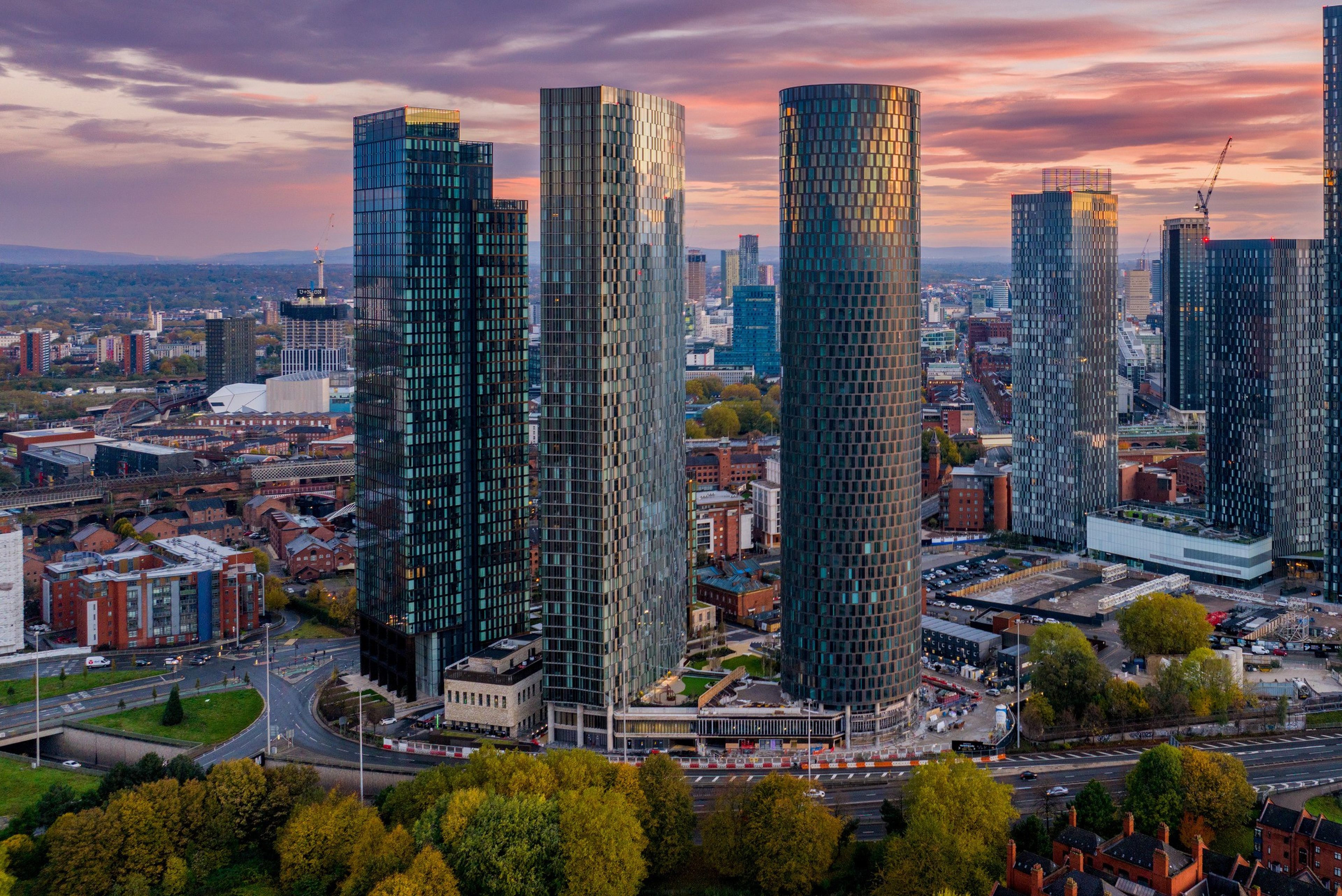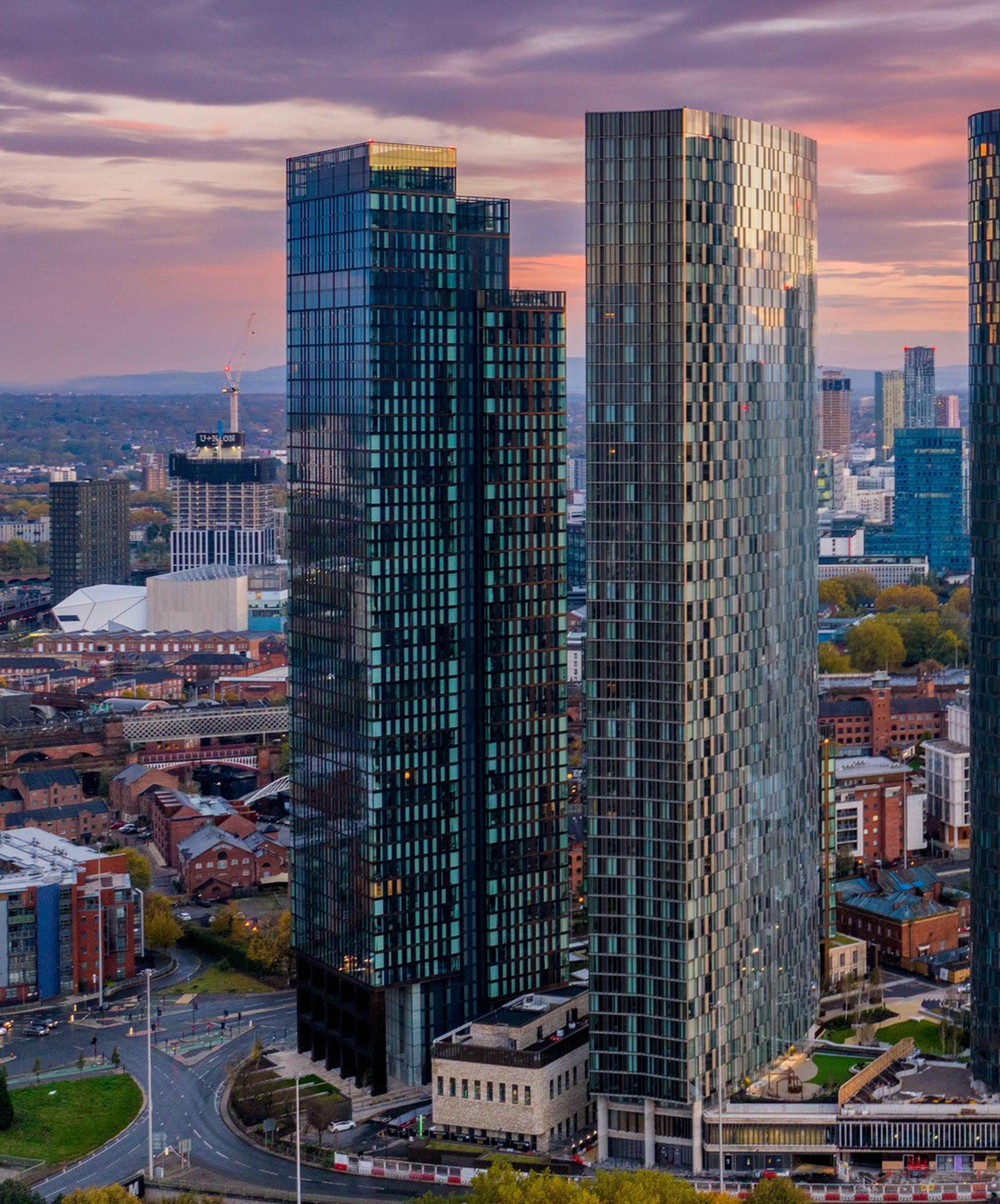 A visual emblem of a rapidly evolving Manchester skyline, The Blade residential skyscraper cuts a striking silhouette across a gateway cluster of tall buildings on the southern approach to the city’s center.