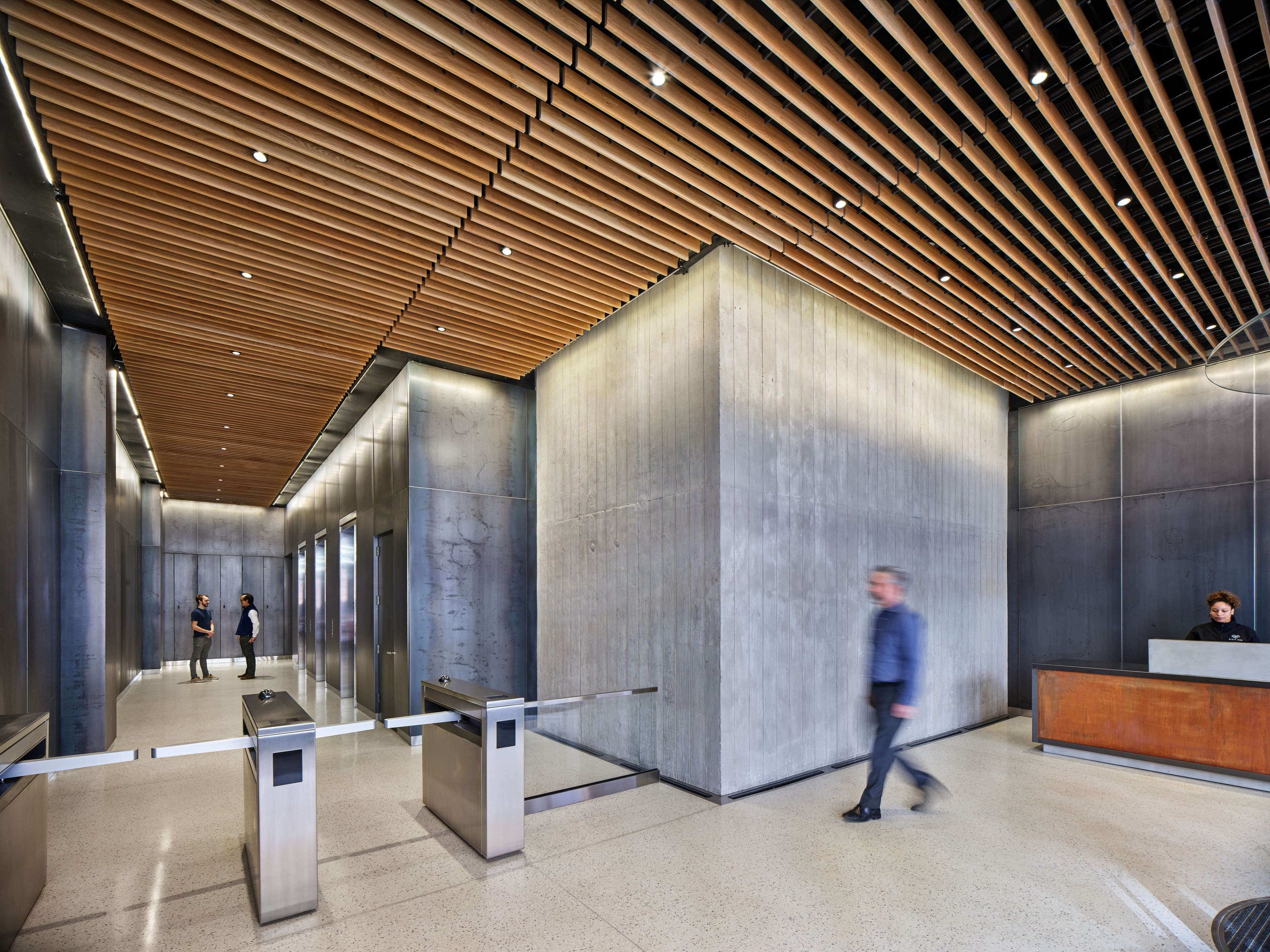 We designed a cast-in-place, flat-slab concrete structure that works in tandem with exposed mechanical systems to allow for flexibility and maximize ceiling heights. This custom-conceived structure facilitates large-span commercial interiors and multiple exterior setbacks that reimagine typical office, conference room, and breakout spaces as integrated indoor-outdoor environments.
