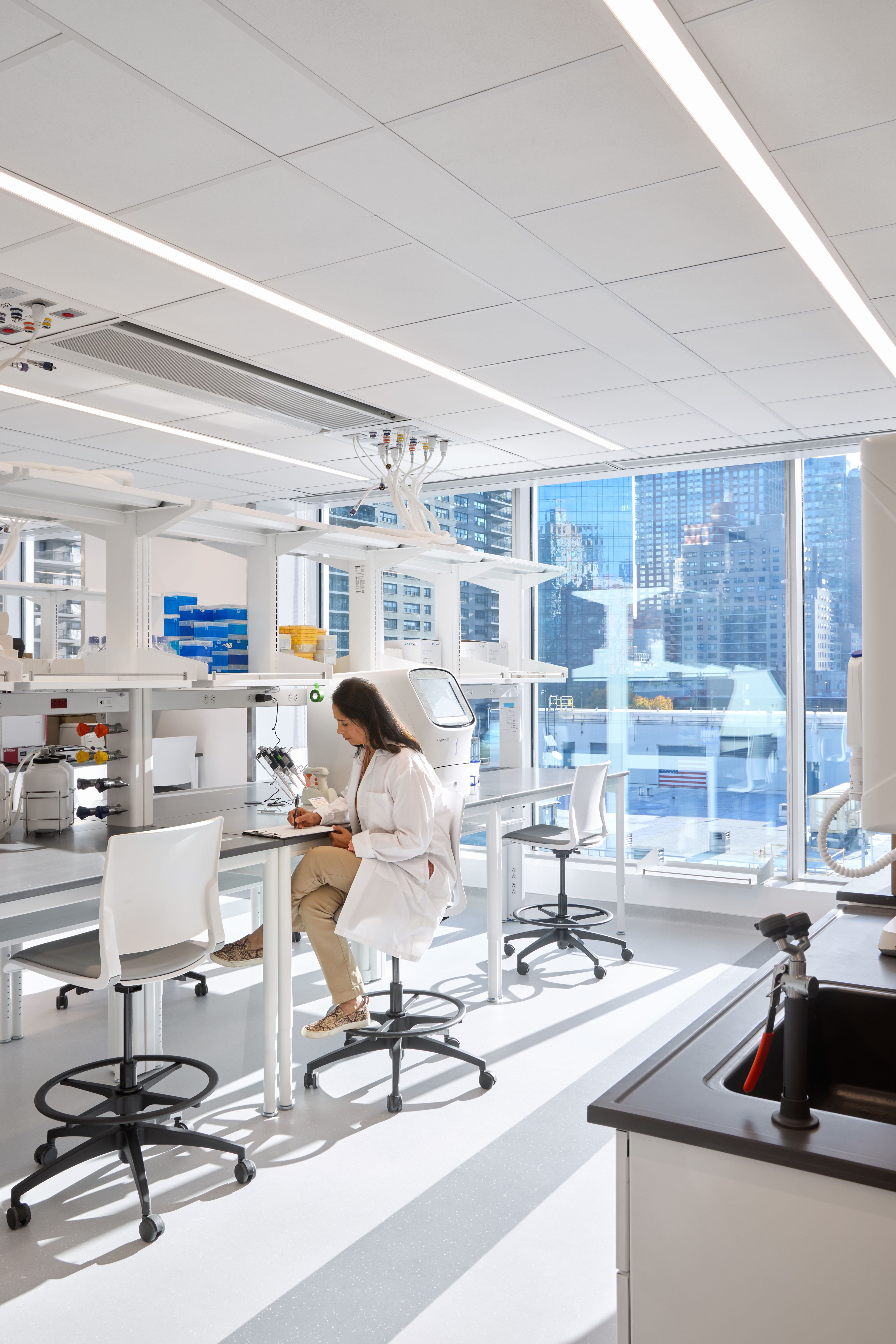 The seven-story, heavy-framed industrial shell now supports a full life sciences program with labs and offices, lab infrastructure, collaborative open spaces, a conference center, café, roof terrace, main common area, and resilient systems.